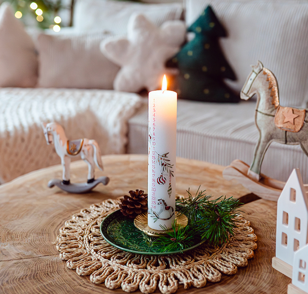 Tato širší adventní svíčka nabízí více prostoru pro detailní ilustrace kolekce Nostalgie.
