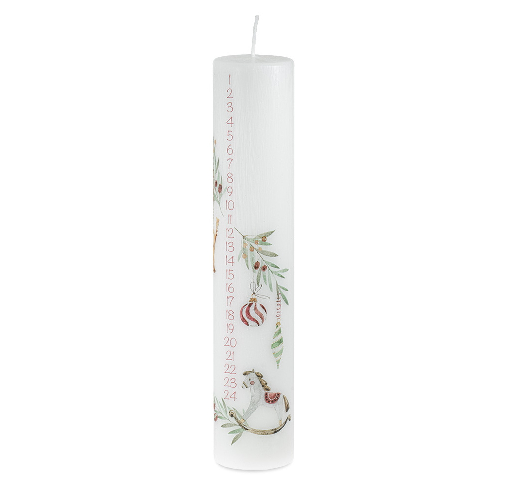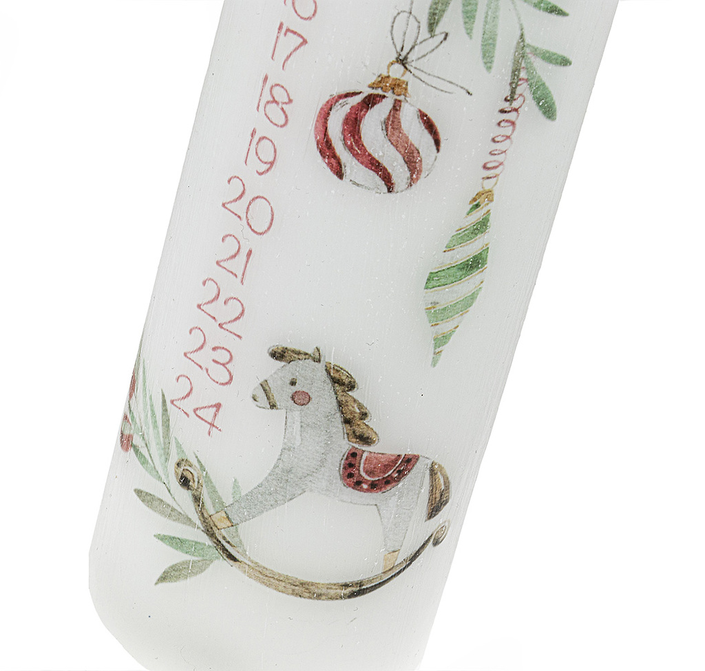 Na přední straně vede jemná číselná řada od 1 do 24 – každý den můžeš doprovodit malým rituálem, kdy necháš svíčku ohořet jen o kousek. Akvarelové motivy houpacího koníčka, vánočních ozdob a zlaté trumpety dodávají adventu klidnou, radostnou atmosféru. Ručně broušený povrch působí něžně a čistě.
