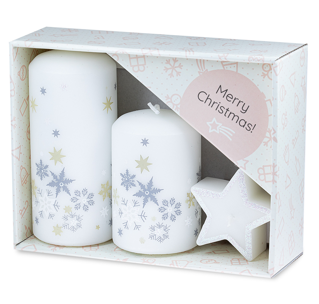 Každá vánoční svíčka je zdobena jemnými vločkami a hvězdičkami, které v mnoha podobách zdánlivě padají a tvoří vrstvy sněhu. Tento detailní design evokuje klidné zimní večery, kdy se krajina halí do sněhové peřiny. Některé detaily na svíčkách jsou navíc třpytivé, jako by byly pokryty mrazivými krystalky, které září jako mráz na sněhu.