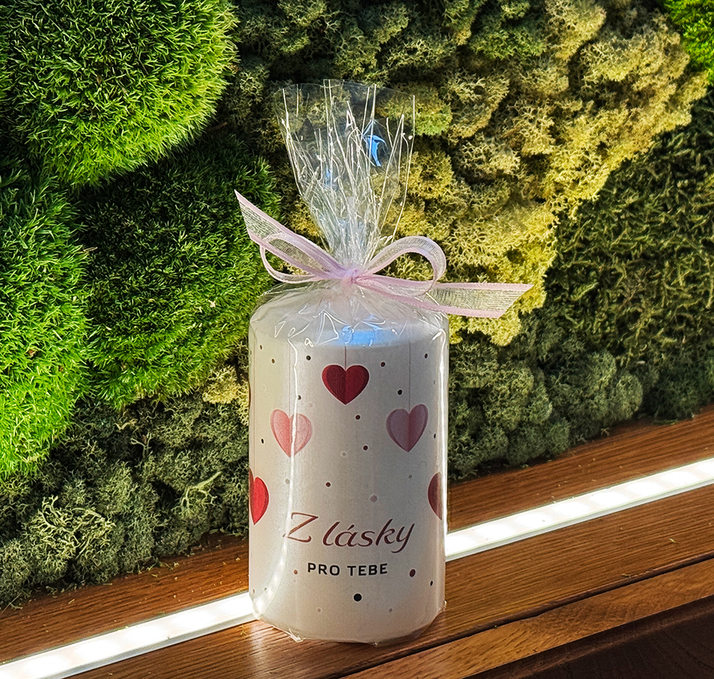 Bílá metalická svíčka se srdíčky nejen pro zamilované. Na svíčce je nápis Z lásky pro tebe.