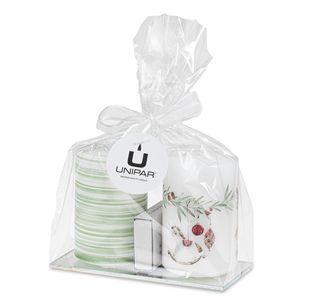 Obě svíčky jsou elegantně vyskládány na skleněném zrcátku, doplněny stylovými zápalkami a zabaleny do celofánu s mašlí. Výsledek působí luxusně, slavnostně a přitom jemně. Perfektní dárek, když chcete potěšit něčím výjimečným, ale ne okázalým.