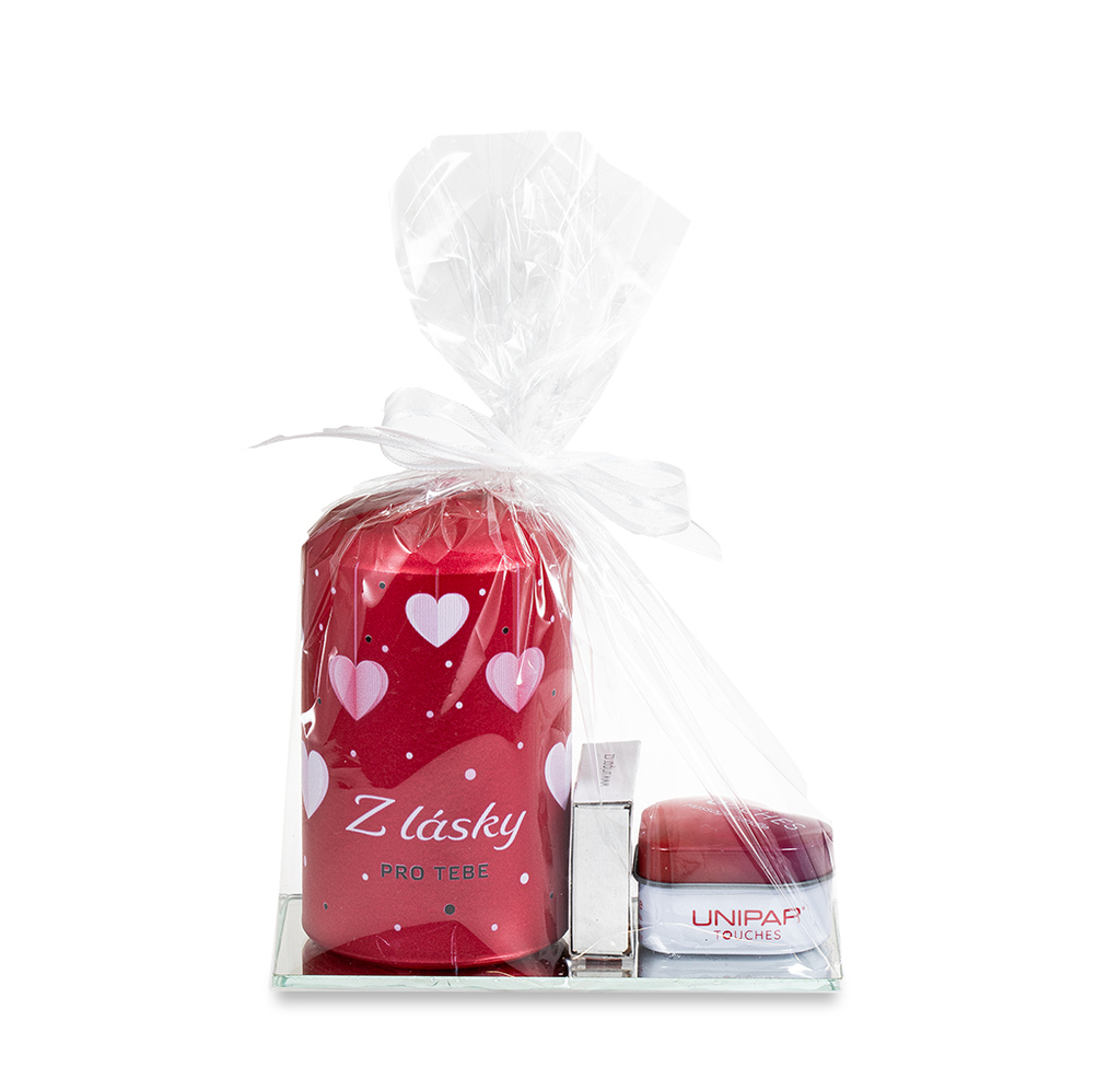 Výrazná červená svíčka s motivem srdíček tvoří středobod celé kompozice a doplňuje ji masážní svíčka ve tvaru srdíčka s vůní divoké višně — sladce ovocná vůně, která zahřeje smysly i atmosféru. Balíček je elegantně usazen na skleněném zrcátku a zabalený do celofánu s mašlí. Přidané zápalky zajišťují, že okamžik světla a vůně může přijít kdykoliv.