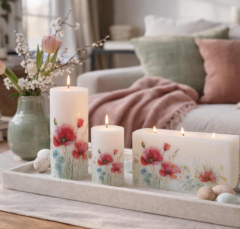 Svíčky z kolekcí Poppy a Poppyline jsou navrženy tak, aby spolu barevně ladily. Kolekce Poppy přináší jemný květinový motiv vlčích máků a lučního kvítí, zatímco kolekce Poppyline používá stejné barvy v moderním lineárním designu.