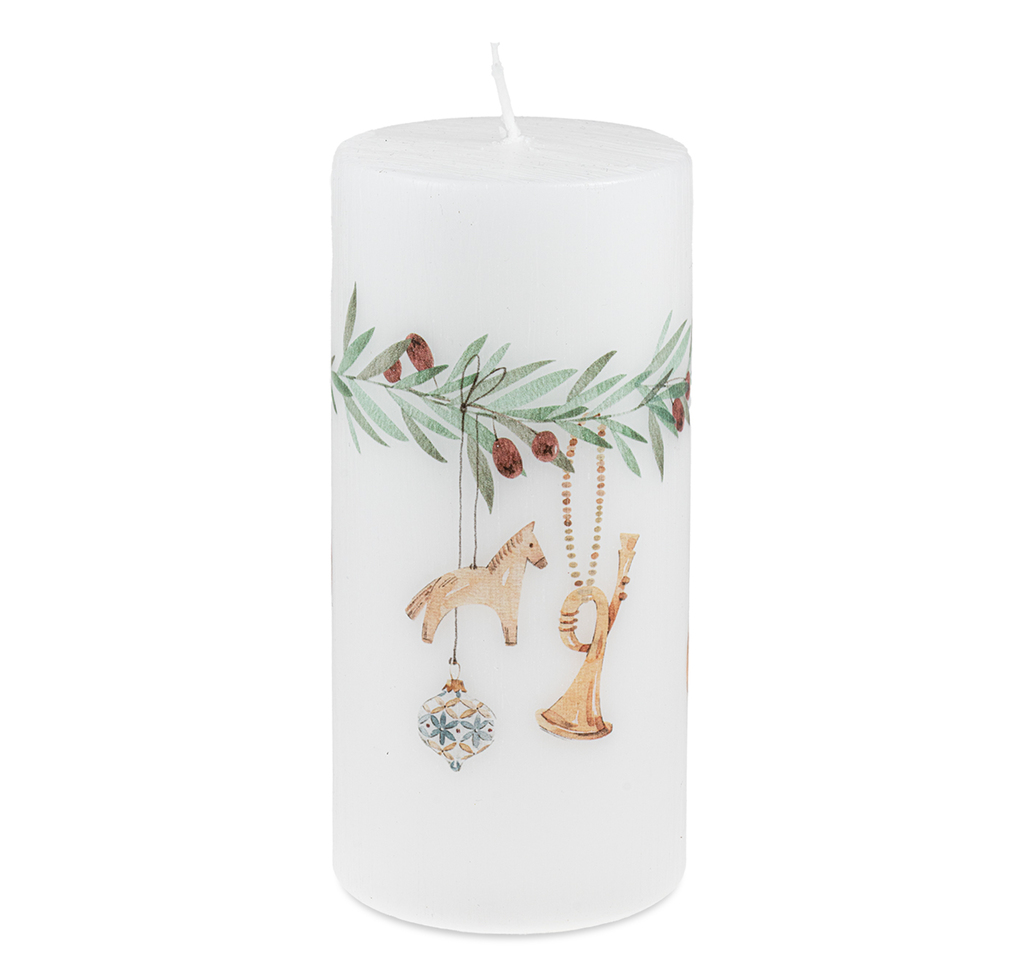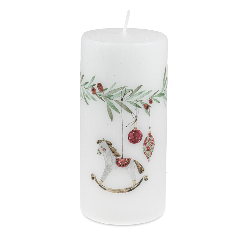 Prostorová kompozice koníčka, trumpetky a ozdob zavěšených na olivových větvích vyniká díky výšce svíčky a detailnímu provedení. Ručně broušený povrch podtrhuje přírodní charakter a dává svíčce luxusně-rustikální výraz. Tento kus snadno vytvoří dominantu zimní výzdoby a dodá prostoru slavnostní atmosféru.