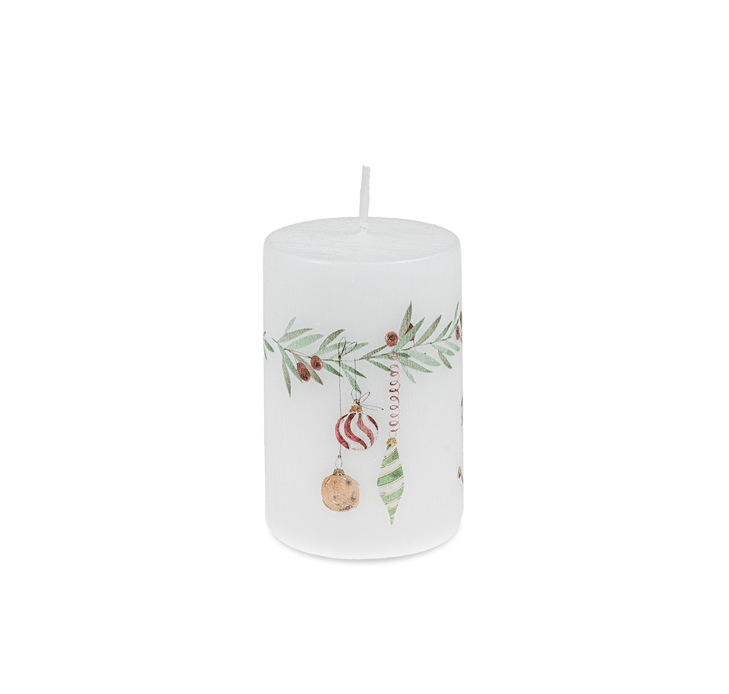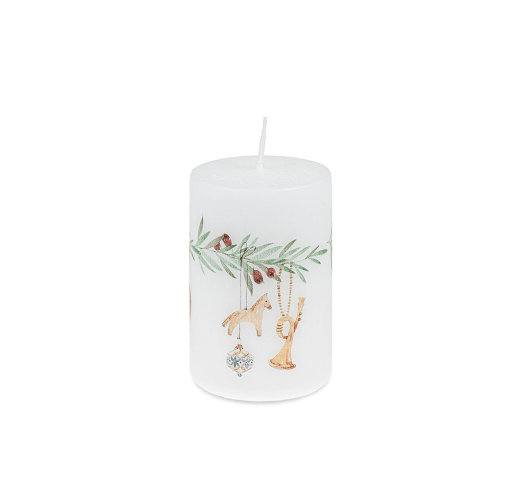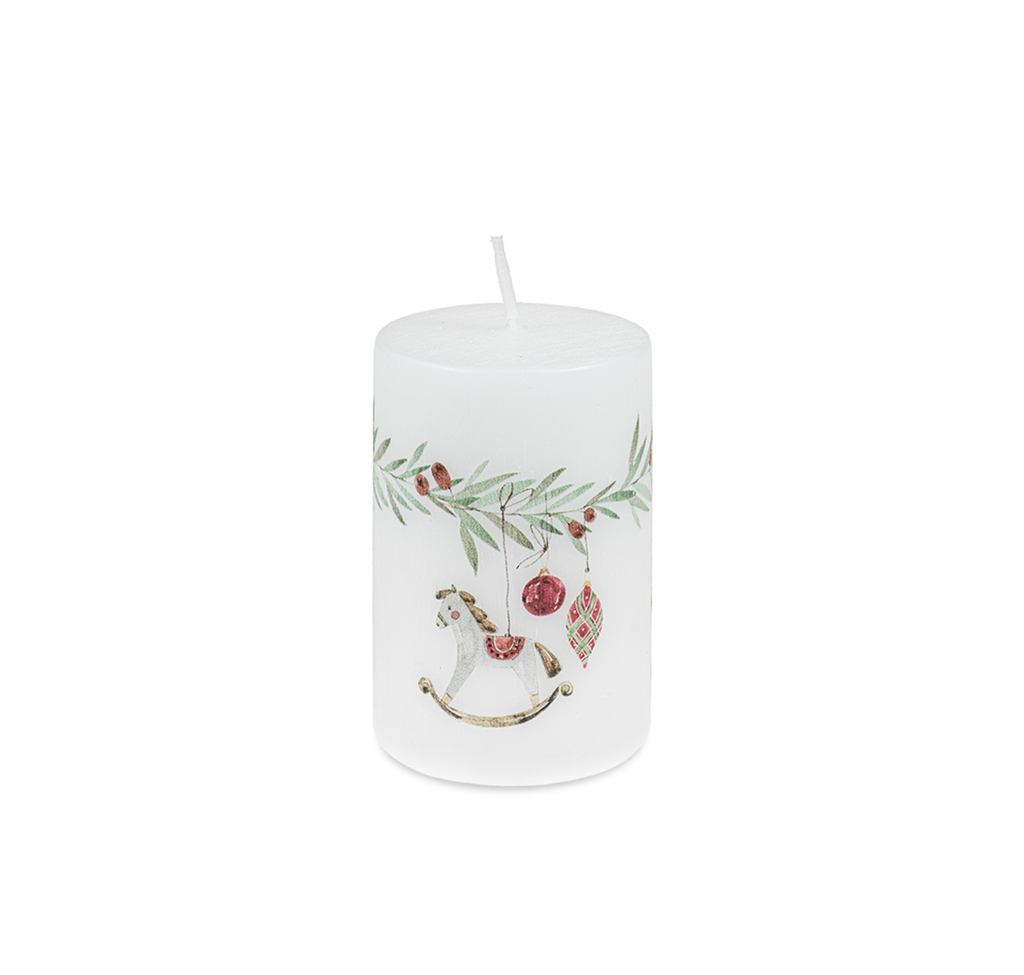 Malá vánoční svíčka z kolekce Nostalgie v sobě nese kousek tichého zimního příběhu. Když plamínek prosvítí její bílý povrch, ilustrace houpacího koníčka a jemných ozdob ožije, jako by se znovu rozezněly kroky Vánoc, na které jsme čekali celý rok.