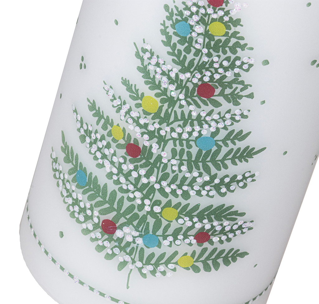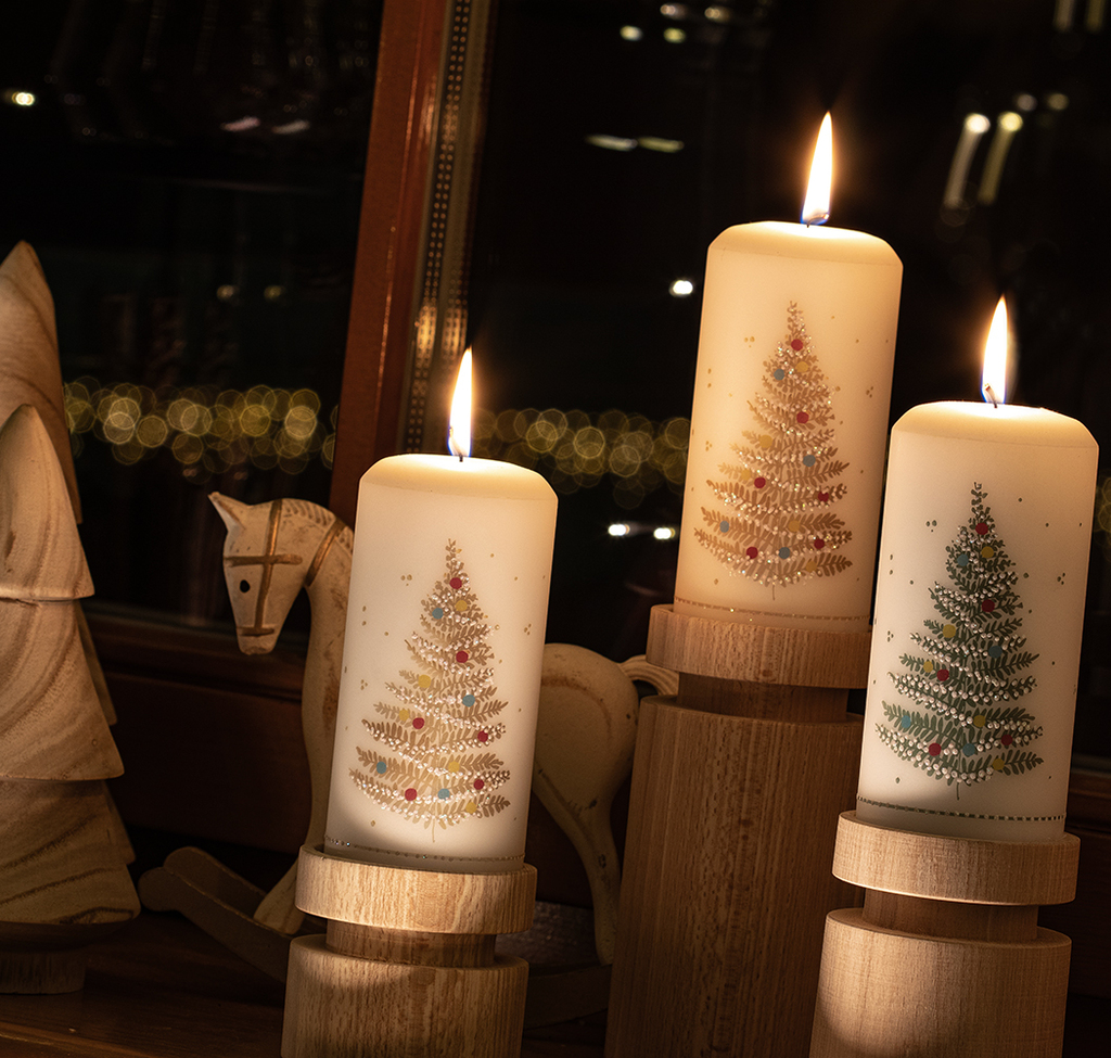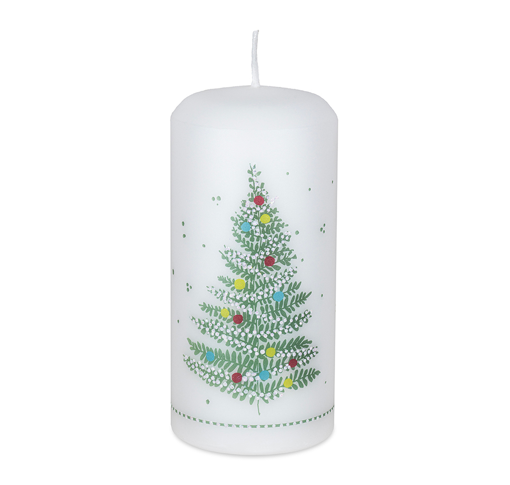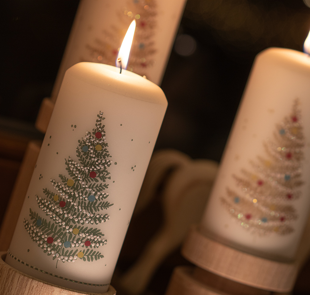 Na závěr dostává každá svíčka svůj jedinečný dotek ruční práce, třpytivé detaily, ručně nanášené tečky a jemná zelená linka, která obíhá spodní část. Tyto ruční akcenty připomínají drobná světýlka, která rozzáří stromek a dodají dekoraci hřejivou atmosféru.