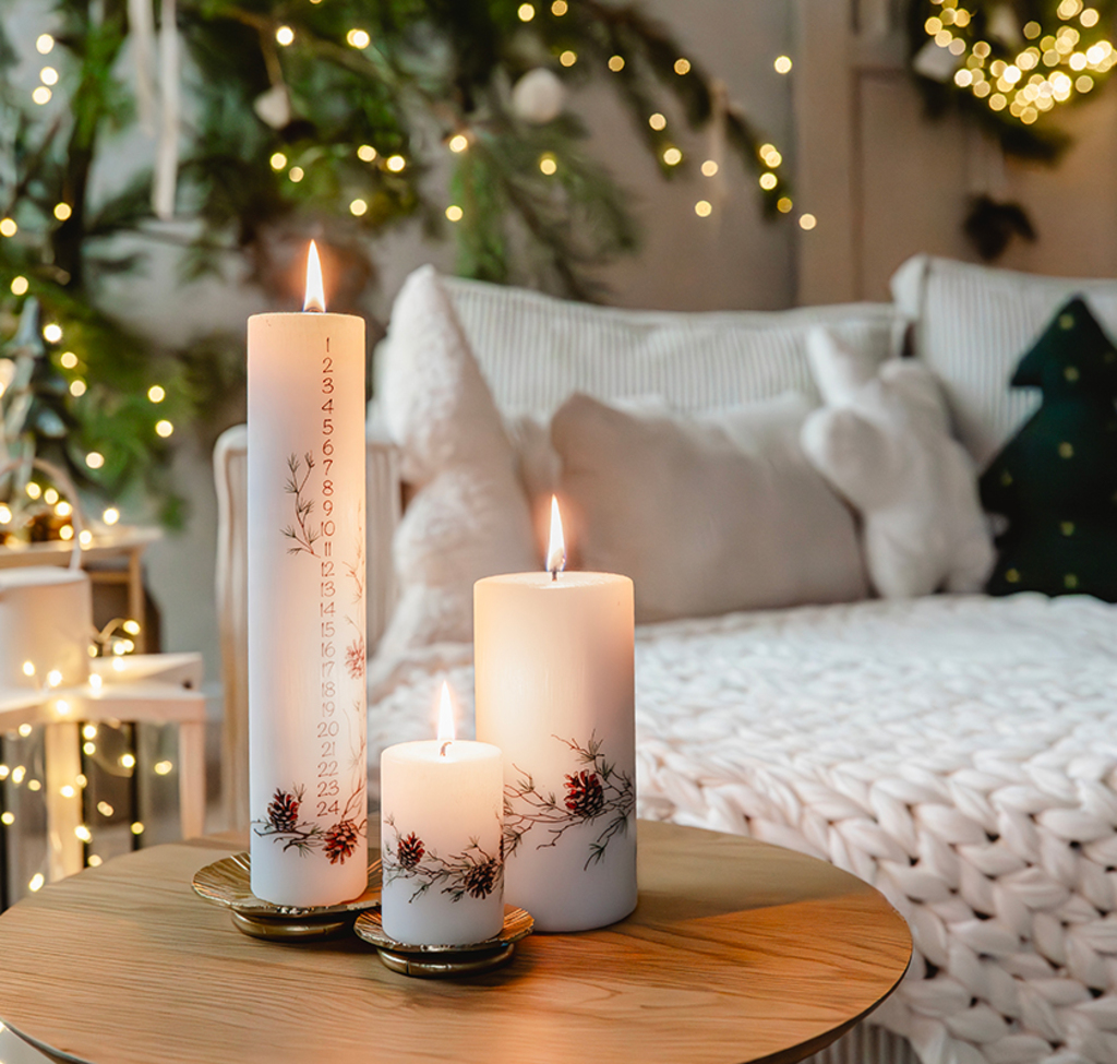 Na bílé svíčce s originálním dekorem větviček borovice o velikosti 5x25 cm jsou natištěny kalendářní dny 1-24 a jak svíčka hoří, čísla postupují až ke Štědrému dni.