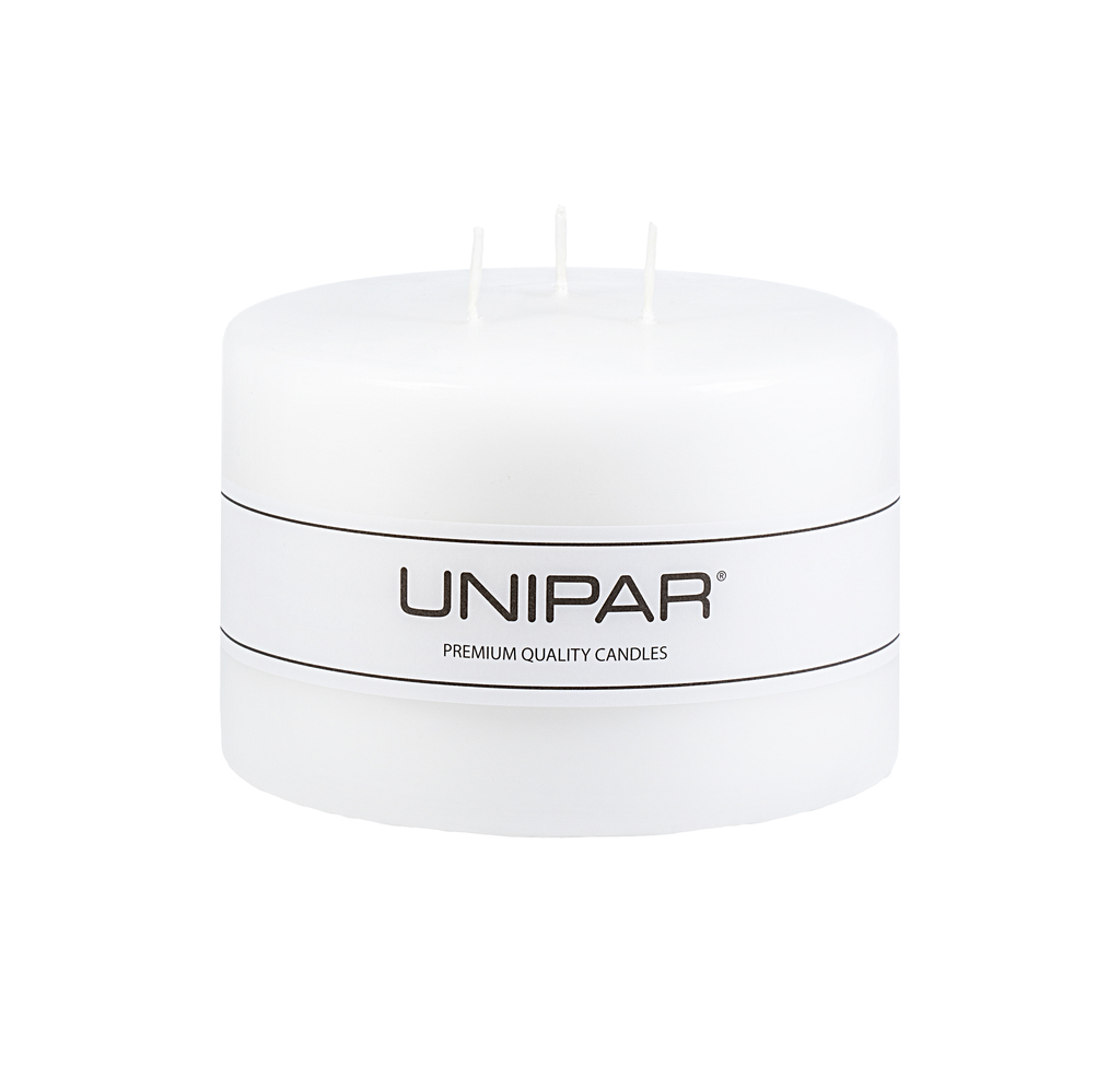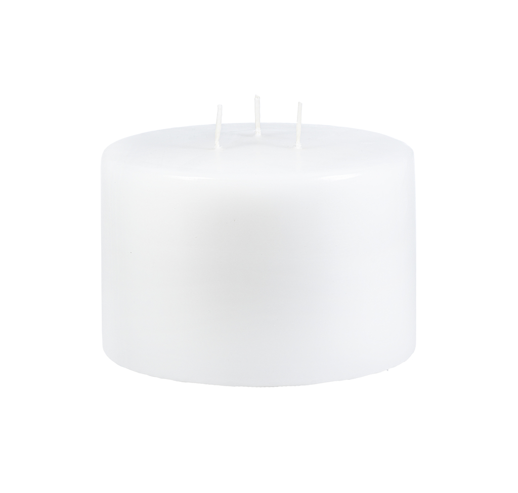 Bílá neutrální válcová svíčka se třemi knoty o průměru 15 cm a výšce 10 cm v jednoduchém skandinávském stylu.
