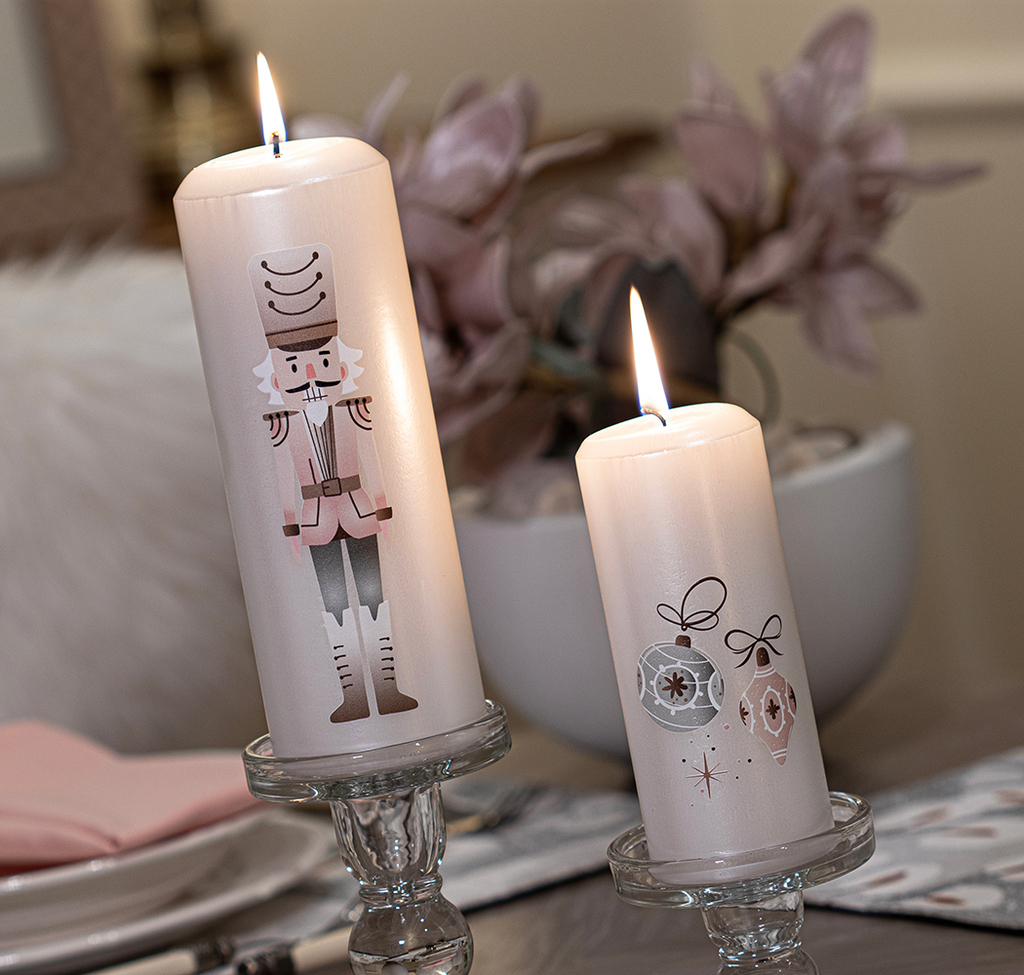 Bílá vánoční svíčka s růžovým louskáčkem (M)
