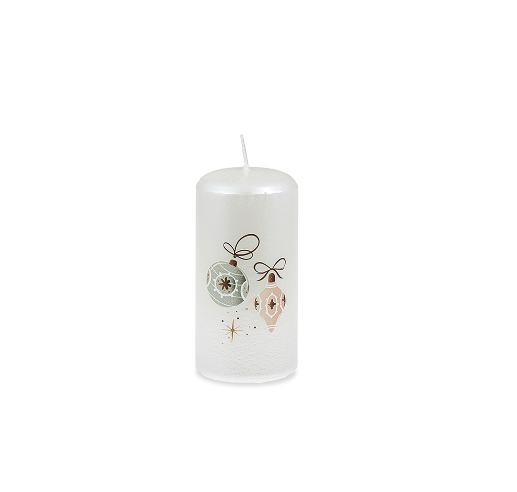 Rozměry 50x100 mm jsou ideální pro menší dekorace nebo jako doplněk k větším svíčkám z této kolekce. Zadní strana se sladěnými vánočními baňkami dává této svíčce univerzální použití a možnost kombinace.