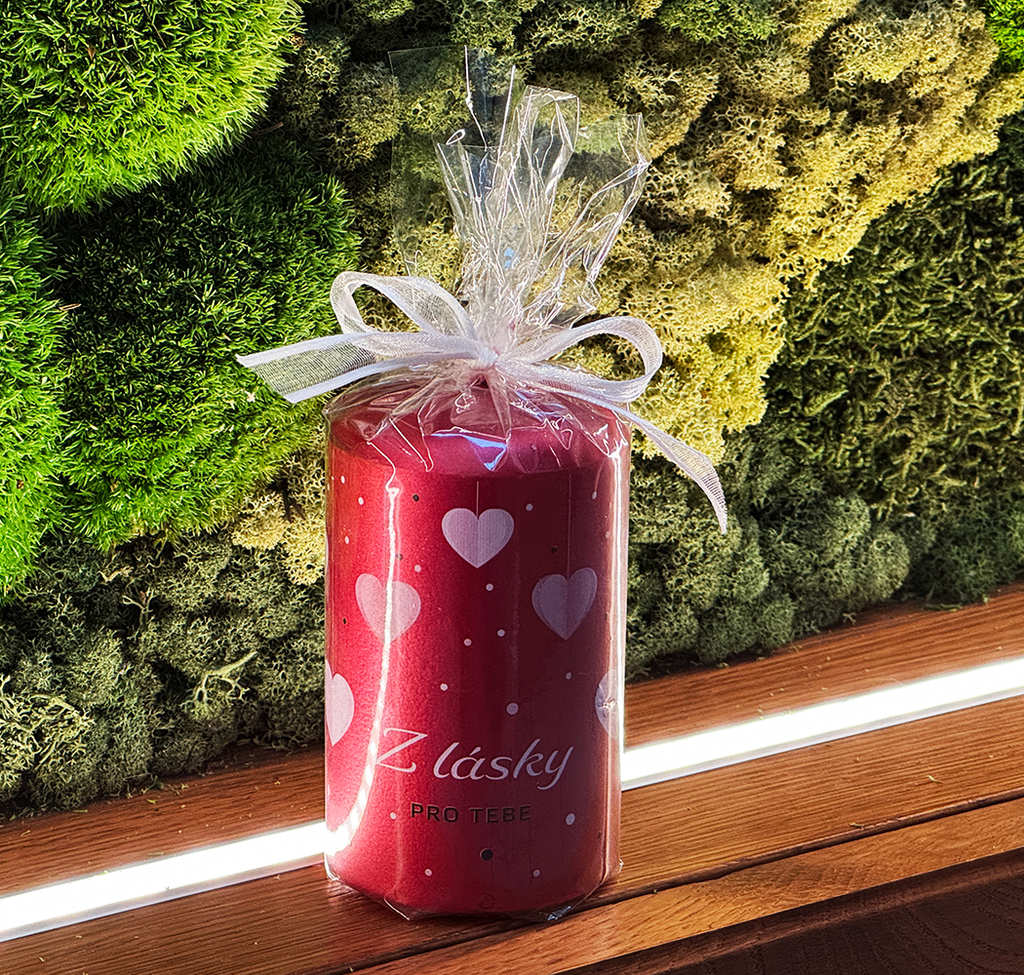 Červená metalická svíčka se srdíčky nejen pro zamilované. Na svíčce je nápis Z lásky pro tebe.