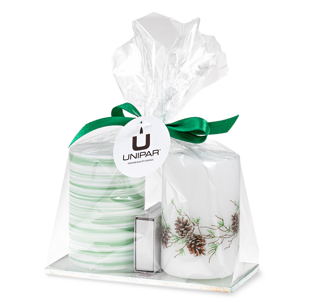 Dárkový balíček dvou svíček z různých kolekcí laděných do zeleno-bílých odstínů.