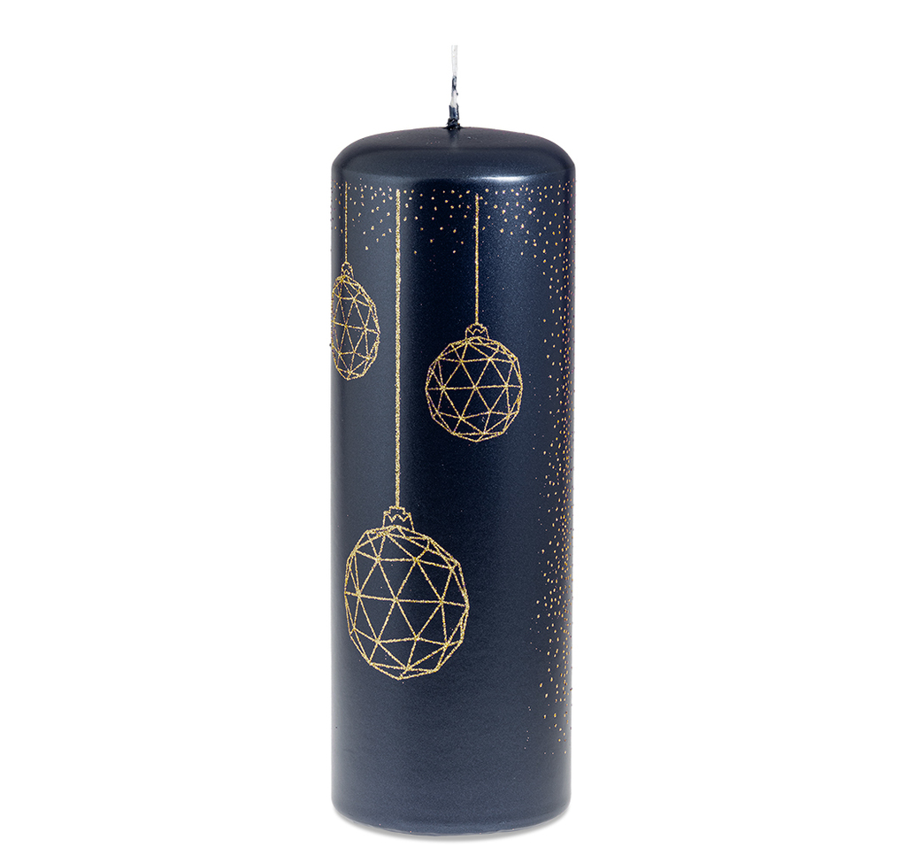 Velká vánoční svíčka nabízí působivý efekt – její vysoký tvar nechává zlaté dekory působit jako závěsnou instalaci. Temná modř dodává kompozici hloubku a působí slavnostně, aniž by byla přehnaná. Je perfektní jako solitér.