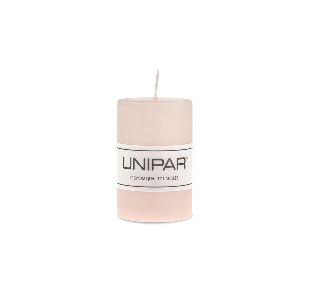 Světle růžová válcová svíčka o velikosti 6x10 cm v jednoduchém skandinávském stylu, která se bude hodit do různých svícnů a luceren (se správnou cirkulací vzduchu), na adventní věnce nebo jako samotná dekorace do vašeho interiéru.