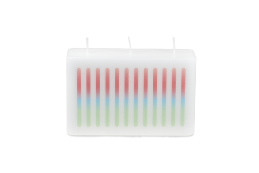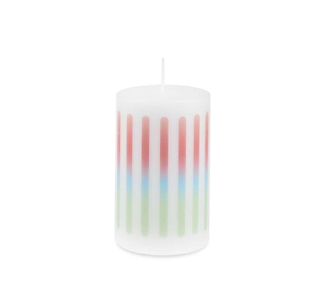 Barevné linie vytvářejí jemný rytmus a připomínají prolínání světla a barev. Svíčka tak působí svěže, hravě a dodává prostoru moderní atmosféru.