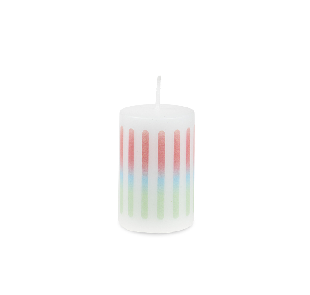 Dekorativní svíčka Poppyline 50 × 75 mm je menší válcová svíčka s moderním motivem úzkých barevných proužků. Na bílém povrchu svíčky se postupně prolíná gradient čtyř barev – zelené, modré, červené a růžové. Minimalistický design vytváří čistý a současný vzhled, díky kterému je svíčka ideální jako drobná dekorace na stůl, poličku nebo do menších aranžmá.