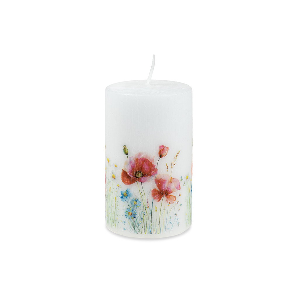 Dekorativní svíčka s květinovým motivem Poppy 60 × 100 mm je válcová svíčka zdobená motivem vlčích máků a lučního kvítí. Bílý vosk doplňuje barevný akvarelový tisk, který vytváří jemný a přirozený vzhled. Povrch svíčky je ručně škrábaný, což dodává svíčce autentický charakter a podtrhuje ruční práci.