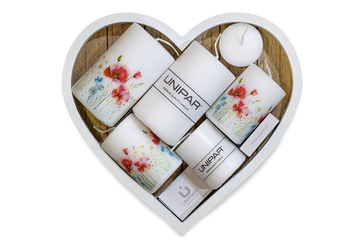 Dekorativní svíčka s vlčími máky Poppy 50 × 75 mm je menší válcová květinová svíčka s motivem lučního kvítí. Bílý vosk doplňuje barevný tisk inspirovaný akvarelovou kresbou, který vytváří jemný a přirozený vzhled. Povrch svíčky je ručně škrábaný, takže každá svíčka působí originálně. Díky své velikosti je ideální jako dekorativní svíčka na stůl, poličku nebo do menších aranžmá.