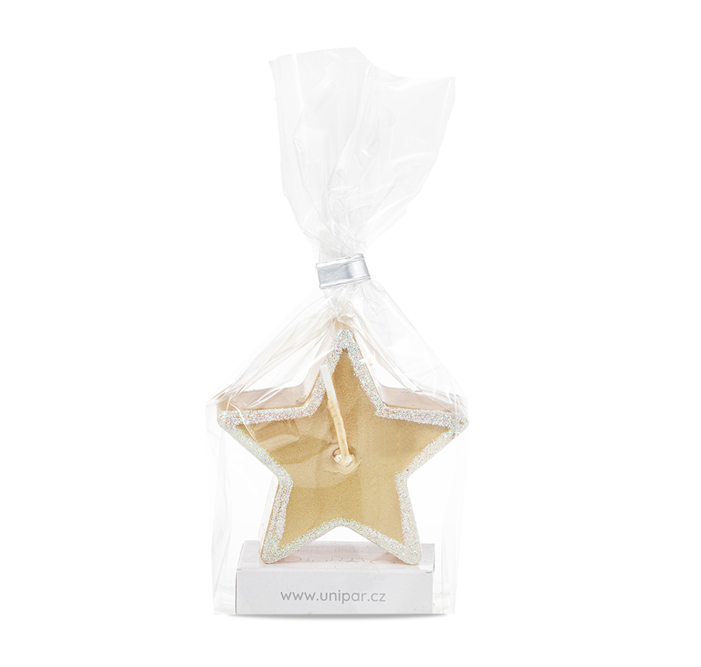 Metalická zlatá svíčka ve tvaru hvězdy z kolekce STAR působí slavnostně a elegantně. Lesklý povrch v kombinaci s ručně zdobenou třpytivou konturou vytváří výrazný, ale stále vkusný celek.